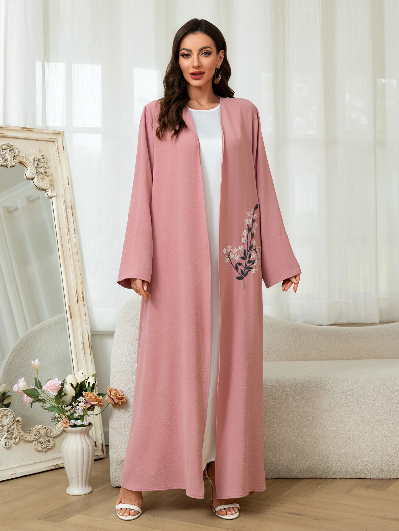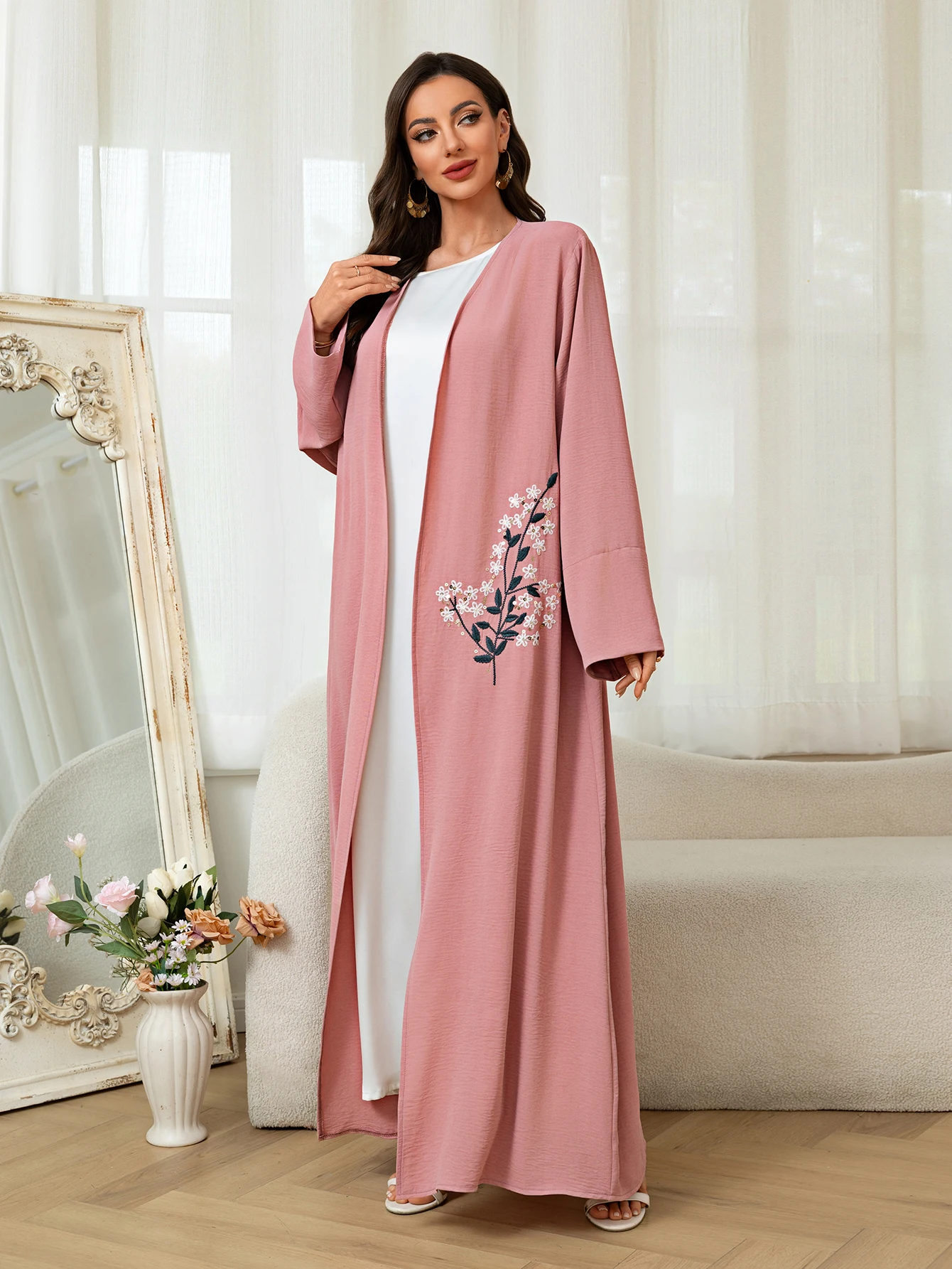 فستان إسلامي متواضع من القطن والكتان للنساء، بتطريز أنيق يناسب رمضان والعيد، تصميم عباية مفتوحة فضفاضة بأكمام طويلة، مستوحى من أزياء دبي وتركيا، يجمع بين الراحة والأناقة المحتشمة.